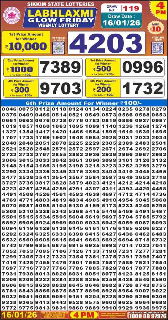 Sikkim State Lottery 16.1.2026 Today Result is Sikkim State Labh laxmi Glow Friday Weekly lottery Result draw whose Sikkim lottery result is published a day. Mainly Sikkim State Lottery is 4:00 pm Sikkim State Lottery but being combined with lottery sambad, Sikkim State Lottery will release the results of 04:00pm is published.