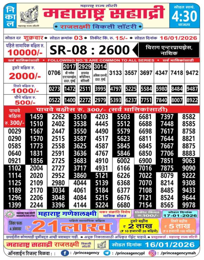 • Maharashtra State Sahyadri Rajlaxmi Lottery 4:30 pm Result 16.1.2026