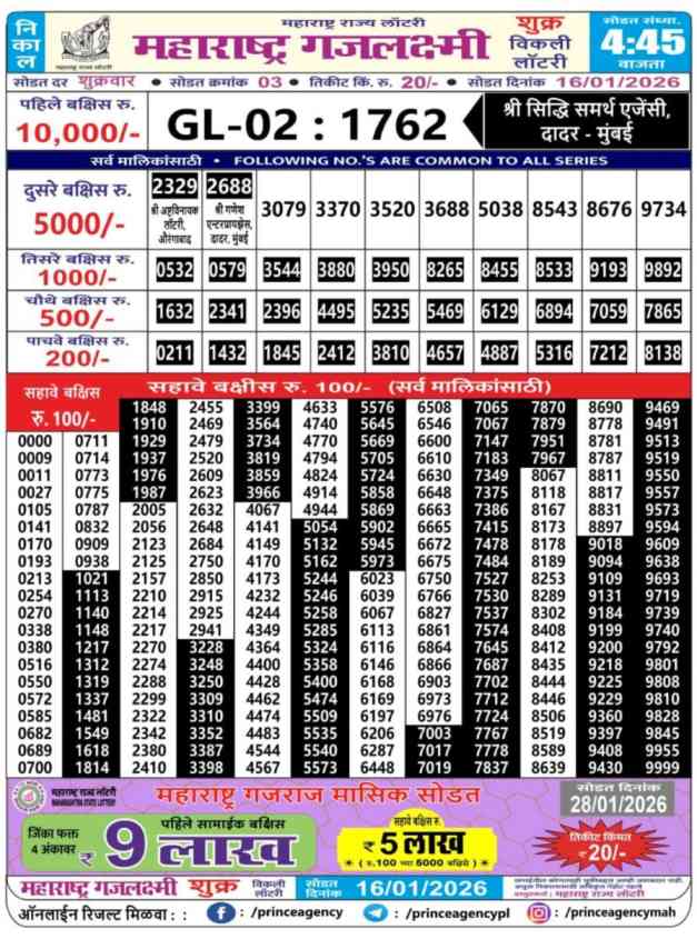 Maharashtra State Gajlaxmi Shukra Weekly Lottery ticket is only Shukra Weekly rupees for 1 ticket, but 1 Lakh is given as prize for winning the major. Results are also placed on this page which you can see Gajlaxmi Shukra Weekly Lottery Result today 16.1.2026 is searched by different names, Maharashtra State Gajlaxmi Shukra Weekly Lottery Result 4:45pm, Maharashtra State lottery 4:45pm result , Maharashtra State Lottery today Gajlaxmi Shukra Weekly lottery result, Maharashtra Gajlaxmi Shukra Lottery Result, Maharashtra State Gajlaxmi Shukra Weekly lottery result 2026, Gajlaxmi Shukra Weekly lottery result 4:45pm, Maharashtra State lottery 2026.
