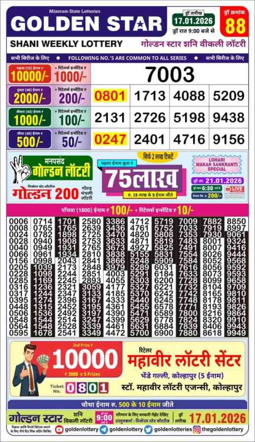 | Mizoram Golden Star shani Weekly Lottery Result Today Live 17.1.2026 | |