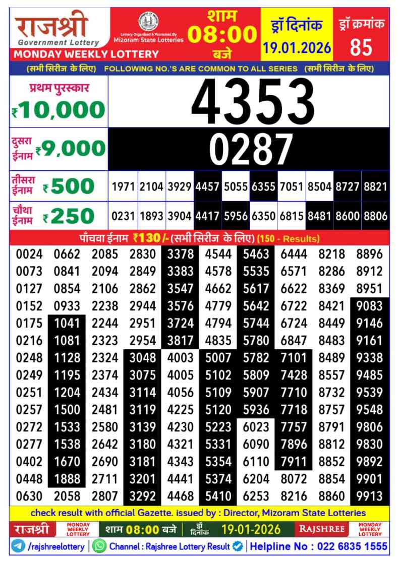 Mizoram Rajshree Lottery declares many bumper results. Today Rajshree Lottery Result 2026 is Mizoram Rajshree Lottery at 08:00 PM whose result gets published on the page around 08:12 PM. Mizoram Rajshree Lottery Result ,19.1.2026 Monday Result, Rajshree Result Today Live 08:00PM, Mizoram Rajshree Monday Weekly Result, Mizoram Rajshree Lottery Result 08:00PM, Mizoram Monday Result 8:00 PM, Mizoram Lottery Result Today 08:00PM, Rajshree Monday Weekly Lottery 8:00 PM Result 19.1.2026.