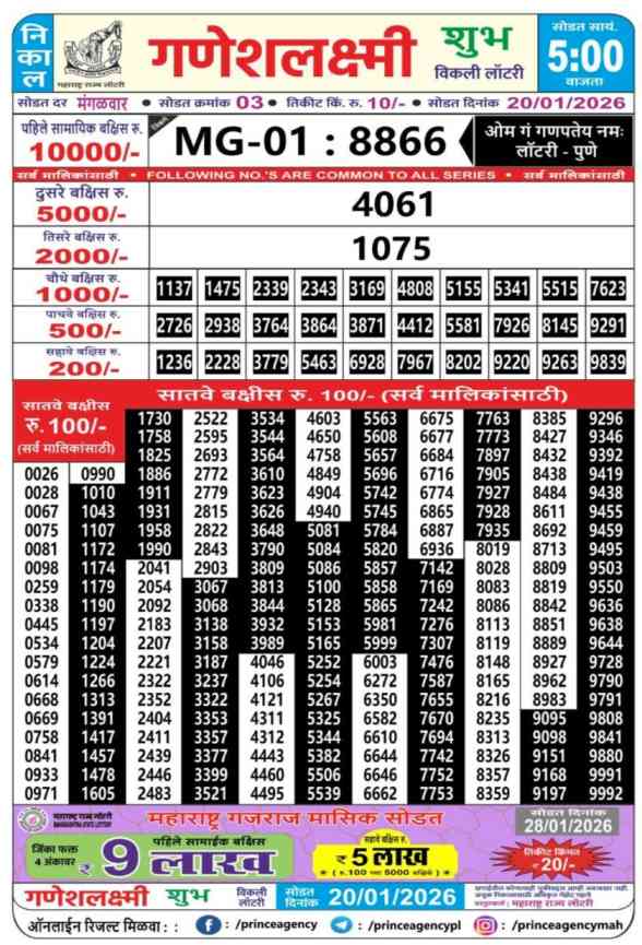 Maharashtra State Ganeshlaxmi Vijayi Weekly Lottery ticket is only Maharashtra Weekly rupees 10 for 1 ticket, but 10 thousand is given as prize for winning the major. Results are also placed on this page which you can see Ganeshlaxmi Vijayi Weekly Lottery Result today 20.1.2026 is searched by different names, Maharashtra State Ganeshlaxmi Vijayi Weekly Lottery Result 05:00pm, Maharashtra State lottery 05:00pm result , Maharashtra State Lottery today Ganeshlaxmi Vijayi Weekly lottery result, Maharashtra Ganeshlaxmi Vijayi Lottery Result, Maharashtra State Ganeshlaxmi Vijayi Weekly lottery result 2026, Ganeshlaxmi Vijayi Weekly lottery result 05:00pm, Maharashtra State lottery 2026.