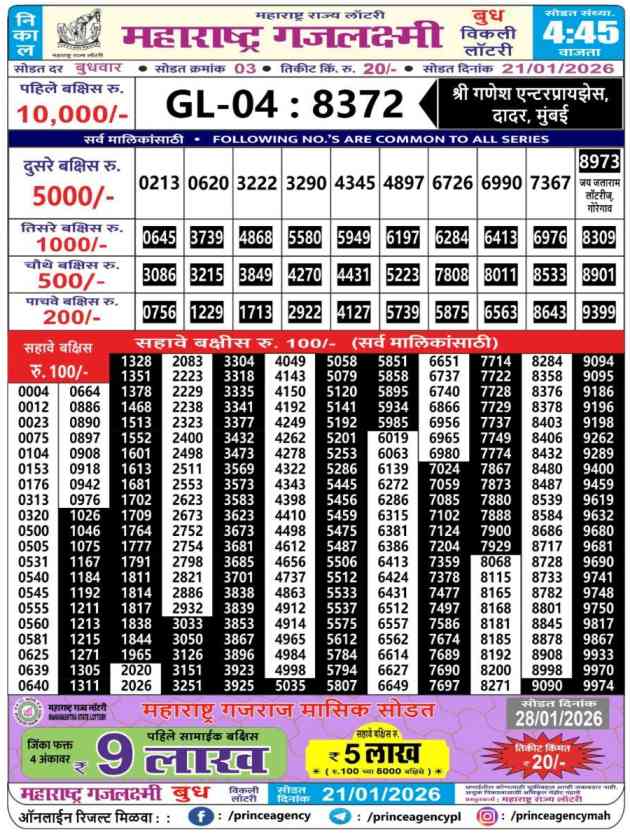 Maharashtra State Lottery declares many bumper results. Gajlaxmi Budh Weekly Lottery Result 2026 is Maharashtra State Lottery at 04:45 PM whose result gets published on the page around 05:30 PM. Maharashtra State Lottery Result , Gajlaxmi Budh Weekly Result, Gajlaxmi Budh Result Today Live 4:45PM, Maharashtra Gajlaxmi Budh Weekly Result 4:45PM, Maharashtra State Gajlaxmi Budh Weekly Result, Maharashtra State lottery result 4:45PM, Gajlaxmi Budh Weekly Result, Gajlaxmi Budh Weekly result, Maharashtra lottery result today 4:45PM, Gajlaxmi Budh Lottery 4:45 PM result , Maharashtra Gajlaxmi Budh Weekly Lottery Result, Gajlaxmi Budh Live Draw.