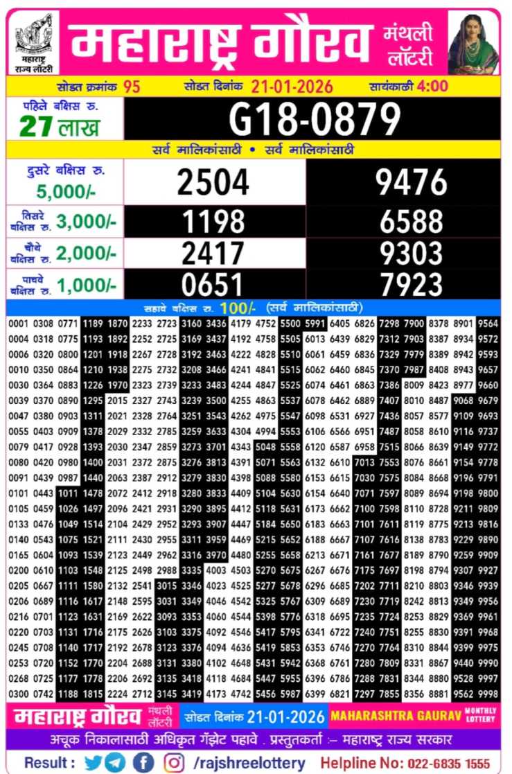 Maharashtra State Lottery 21.1.2026 Today Result is Maharashtra State Gaurav Monthly lottery Result draw whose Maharashtra lottery result is published a day. Mainly Maharashtra State Lottery is Provided Today Gaurav Monthly Lottery 04:00PM Result, Maharashtra State Lottery but being combined with Maharashtra lottery sambad, Maharashtra State Lottery will release the results of Today Gaurav Monthly Result Live 04:00pm.