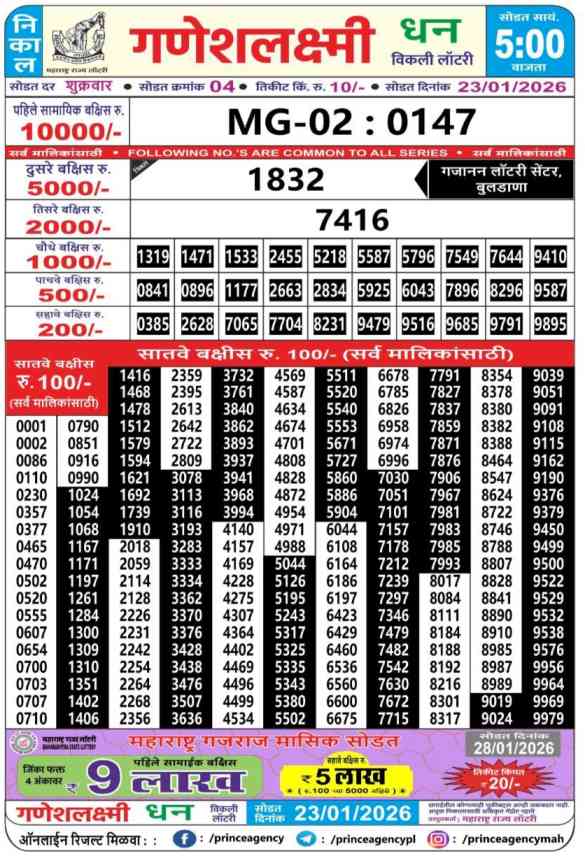 | Maharashtra Ganeshlaxmi Dhan Weekly Lottery Result Today Live 23.1.2026 | |