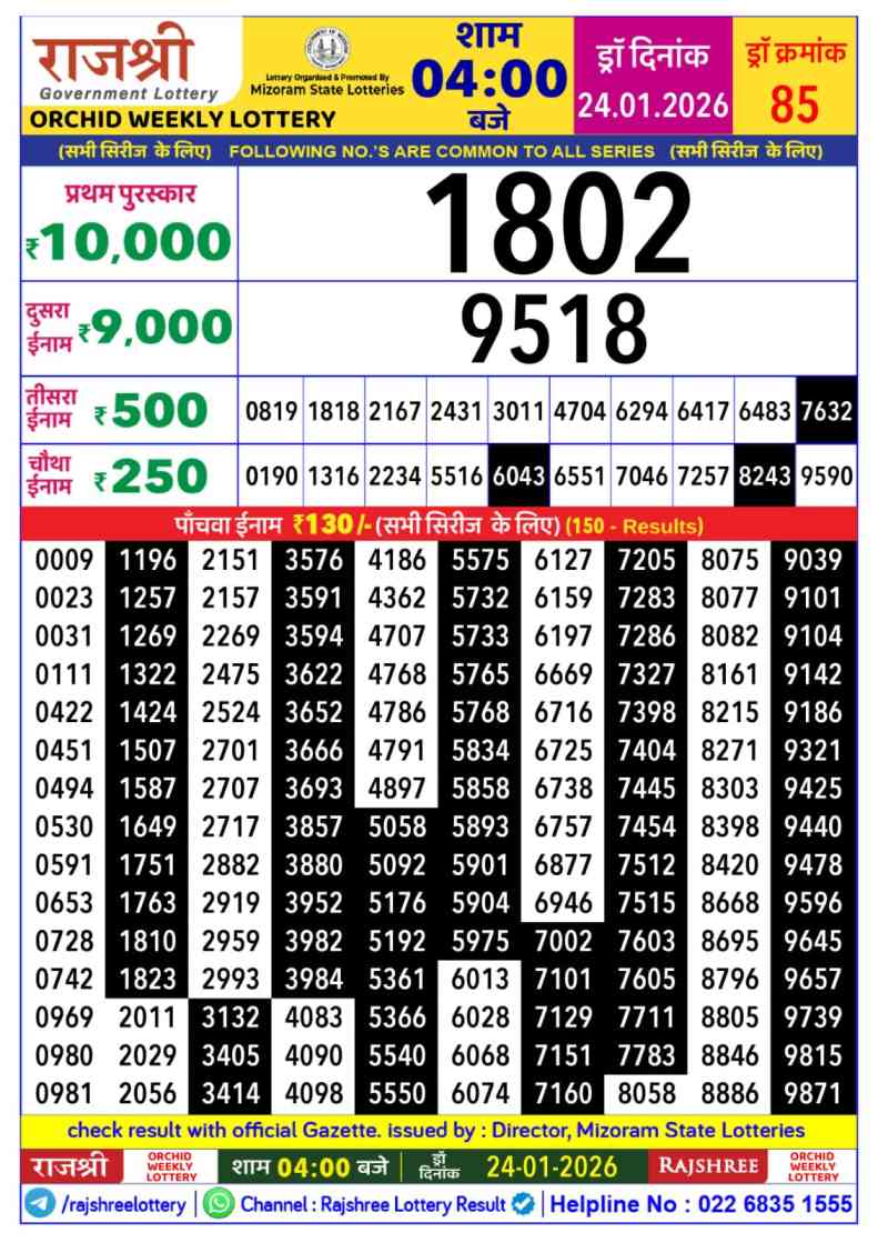 Mizoram Rajshree Lottery declares many bumper results. Today Rajshree Orchid Lottery Result 2026 is Mizoram Rajshree Lottery at 03:30 PM whose result gets published on the page around 04:12 PM. Mizoram Rajshree Lottery Result ,24.1.2026 Orchid Shani Result, Rajshree Orchid Result Today Live 4:00PM, Mizoram Rajshree Orchid Shani Weekly Result, Mizoram Rajshree Lottery Result 4:00PM, Mizoram Orchid Shani Result 3:30 PM, Mizoram Lottery Result Today 4:00PM, Rajshree Orchid Weekly Lottery 3:30 PM Result 24.1.2026.