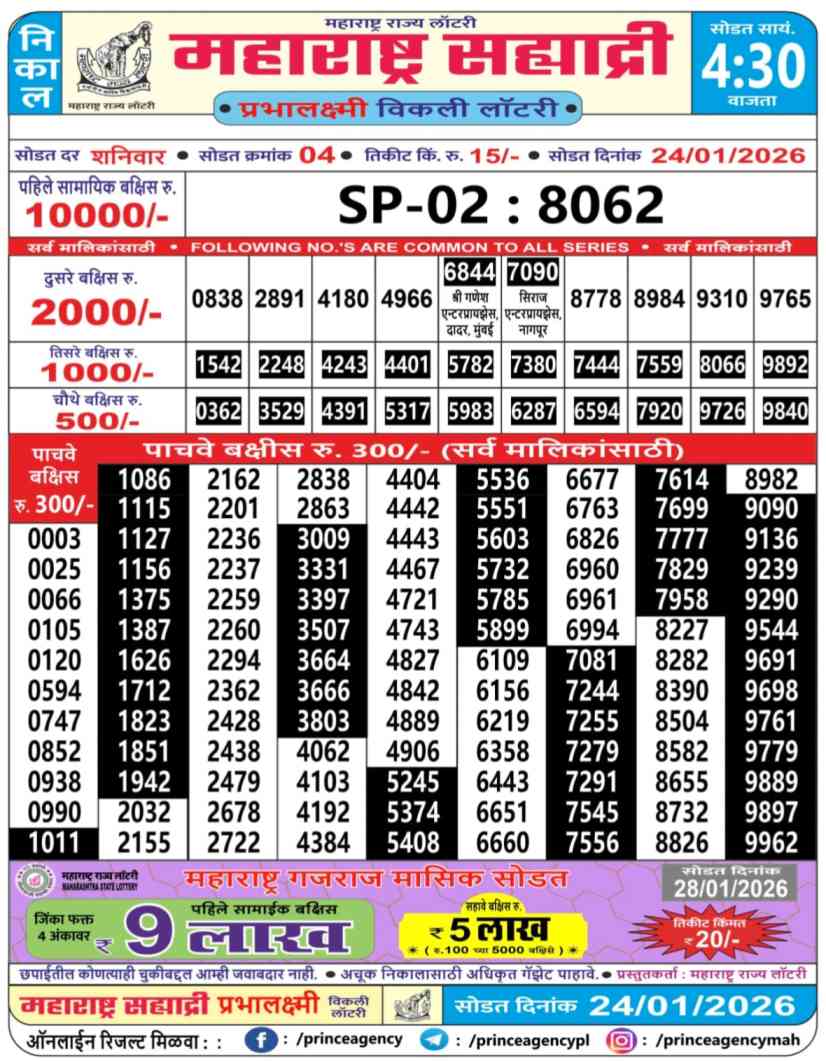 | Maharashtra State Sahyadri Prabhalaxmi Weekly Lottery 24.1.2026 Result | Maharashtra State Lottery 4:30PM Result | Maharashtra State Sahyadri Prabhalaxmi Weekly Lottery Result Today 4:30PM| Maharashtra State Lottery Result 4:30PM Today Live Draw | Maharashtra State Lottery | Check Maharashtra Sahyadri Prabhalaxmi Weekly Weekly Lottery Result | |
