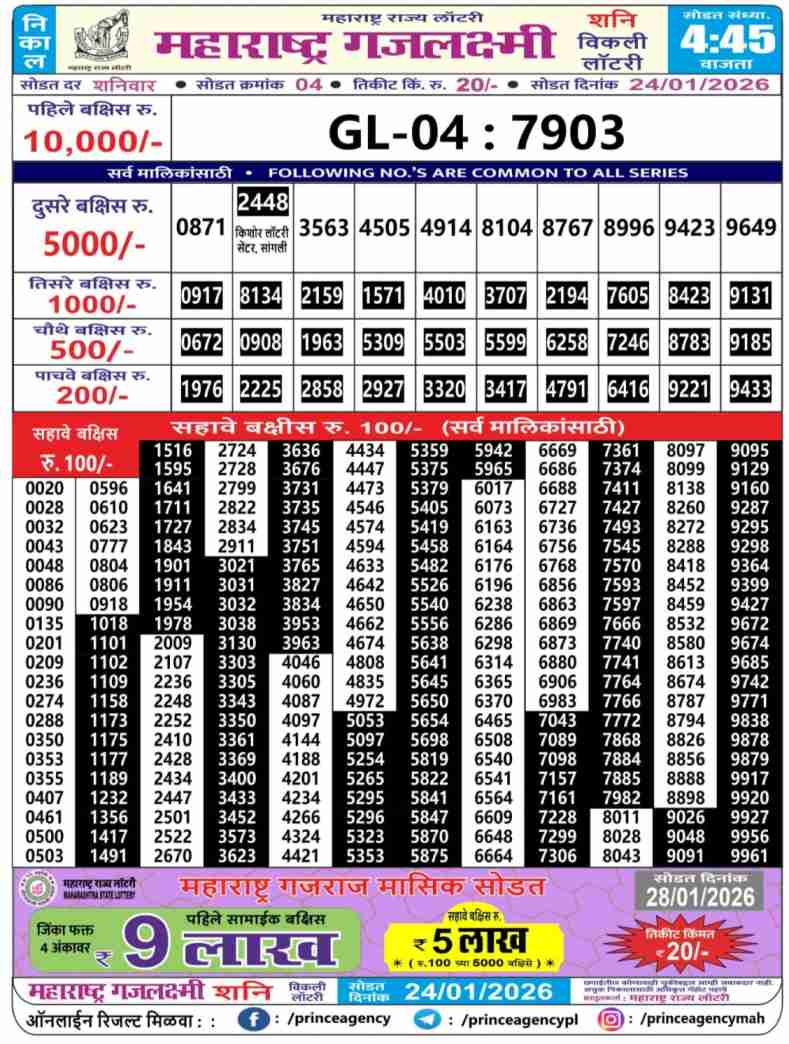 Maharashtra State Lottery declares many bumper results. Gajlaxmi Shani Weekly Lottery Result 2026 is Maharashtra State Lottery at 04:45 PM whose result gets published on the page around 05:30 PM. Maharashtra State Lottery Result ,24.1.2026 Gajlaxmi Shani Weekly Result, Gajlaxmi Shani Result Today Live 4:45PM, Maharashtra Gajlaxmi Shani Weekly Result 4:45PM, Maharashtra State Gajlaxmi Shani Weekly Result, Maharashtra State lottery result 4:45PM, Gajlaxmi Shani Weekly Result, Gajlaxmi Shani Weekly result, Maharashtra lottery result today 4:45PM, Gajlaxmi Shani Lottery 4:45 PM result 24.1.2026, Maharashtra Gajlaxmi Shani Weekly Lottery Result, Maharashtra Gajlaxmi Shani Live Draw.