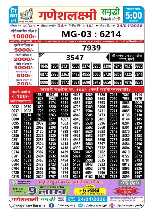 Maharashtra State Ganeshlaxmi Samriddhi Weekly Lottery ticket is only Maharashtra Weekly rupees 10 for 1 ticket, but 10 thousand is given as prize for winning the major. Results are also placed on this page which you can see Ganeshlaxmi Samriddhi Weekly Lottery Result today 24.1.2026 is searched by different names, Maharashtra State Ganeshlaxmi Samriddhi Weekly Lottery Result 05:00pm, Maharashtra State lottery 05:00pm result , Maharashtra State Lottery today Ganeshlaxmi Samriddhi Weekly lottery result, Maharashtra Ganeshlaxmi Samriddhi Lottery Result, Maharashtra State Ganeshlaxmi Samriddhi Weekly lottery result 2026, Ganeshlaxmi Samriddhi Weekly lottery result 05:00pm, Maharashtra State lottery 2026.