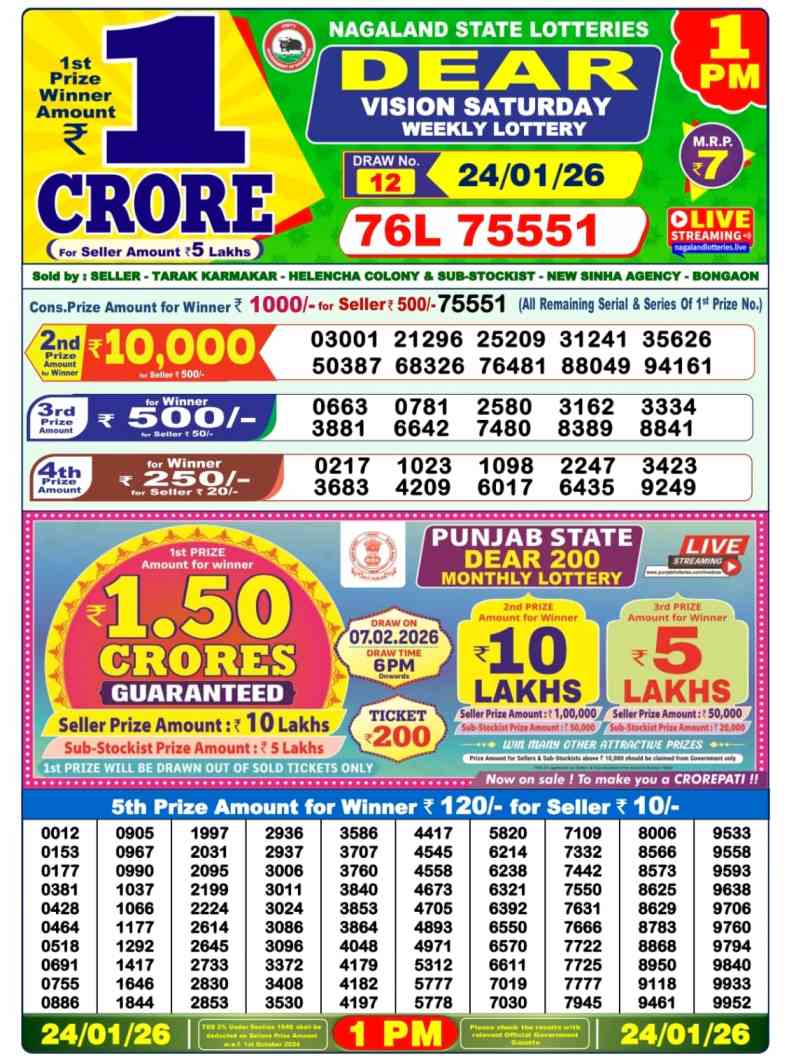 As per the official information provided by the Nagaland State Lotteries, 27.1.2026 Results the winner of today’s Dear First Winner award will receive INR 1 Crore from a ticket worth INR 6. You can check your result from the lotterysambad 27 1 26 link given below…