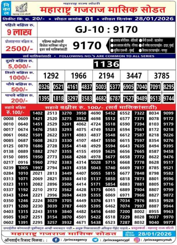 Maharashtra State Lottery 28.1.2026 Today Result is weekly lottery draw whose Maharashtra lottery result is published a day. Mainly Maharashtra State Lottery is 4:00 pm Maharashtra State Lottery but being combined with lottery sambad, Maharashtra State Lottery will release the results of 04:00pm is published.Maharashtra State Lottery Gajraj Monthly Lottery Result.