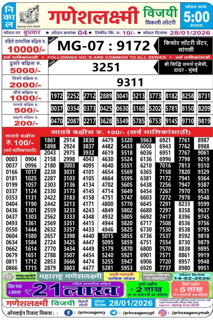 | Maharashtra Ganeshlaxmi Vijayi Weekly Lottery Result Today Live 28.1.2026 | |