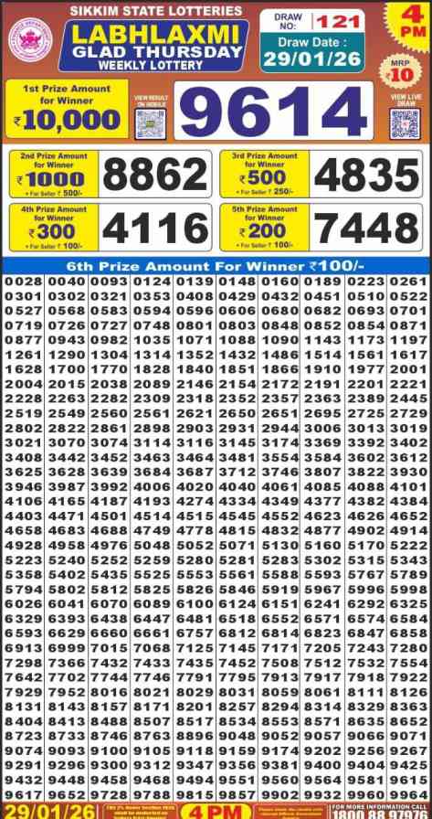 Sikkim State Lottery declares many bumper results. Labh laxmi Thursday Weekly Lottery Result 29.1.2026 is Sikkim State Lottery at 04:00 PM whose result gets published on the page around 04:12 PM. Sikkim State Lottery Result , Labh laxmi Glad Result, Labh laxmi Thursday Result Today Live 4PM, Sikkim Labh laxmi Weekly Result 4PM, Sikkim State Labh laxmi Glad Thursday Result, Sikkim State lottery result 4PM, Labh laxmi Thursday Weekly Result 29.1.2026, Labh laxmi Glad result, Sikkim Labh laxmi 4 PM Result, Sikkim lottery result today 4PM, Labh laxmi Thursday Lottery 4 PM result , Sikkim Labh laxmi Thursday Weekly Lottery Result, Sikkim Labh laxmi Thursday Live 29.1.2026 Draw.