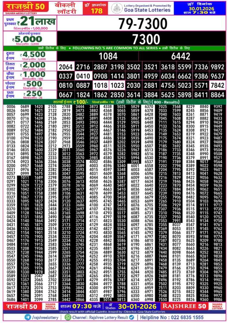 Download Goa Rajshree Lottery 50 Shani 30.1.2026 Today 7:30pm Result from here. Goa Rajshree 50 Weekly Lottery Result Important Lottery of Goa Rajshree which is legally operated by the Rajshree Government there. You are satisfied to Get The Result of 50 Shani weekly Lottery at 07:30pm on this webpost Today’s Lottery Result of Goa Rajshree Lottery 7:30pm is published here.