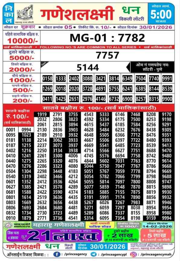 | Maharashtra Ganeshlaxmi Dhan Weekly Lottery Result Today Live 30.1.2026 | |