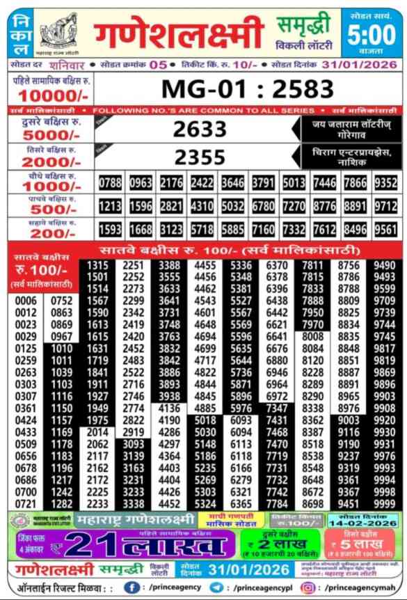 Maharashtra State Ganeshlaxmi Samriddhi Weekly Lottery ticket is only Maharashtra Weekly rupees 10 for 1 ticket, but 10 thousand is given as prize for winning the major. Results are also placed on this page which you can see Ganeshlaxmi Samriddhi Weekly Lottery Result today 31.1.2026 is searched by different names, Maharashtra State Ganeshlaxmi Samriddhi Weekly Lottery Result 05:00pm, Maharashtra State lottery 05:00pm result , Maharashtra State Lottery today Ganeshlaxmi Samriddhi Weekly lottery result, Maharashtra Ganeshlaxmi Samriddhi Lottery Result, Maharashtra State Ganeshlaxmi Samriddhi Weekly lottery result 2026, Ganeshlaxmi Samriddhi Weekly lottery result 05:00pm, Maharashtra State lottery 2026.