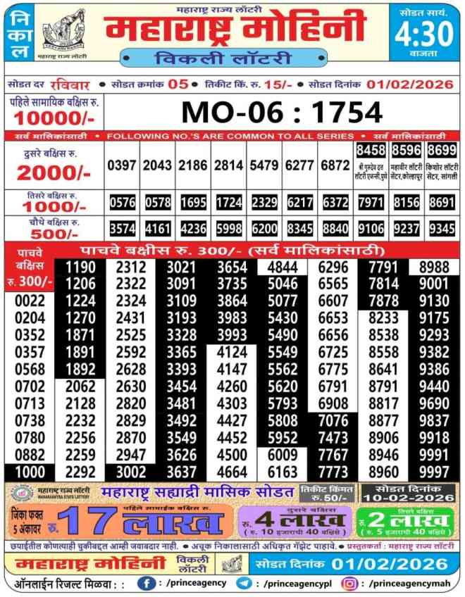 Maharashtra State Mohini Lottery Weekly Today Latest Update on 01 February 2026 : -Maharashtra State Lottery’s Mohini Weekly Lottery Results have been declared today on 1.2.2026 at 04:15PM.