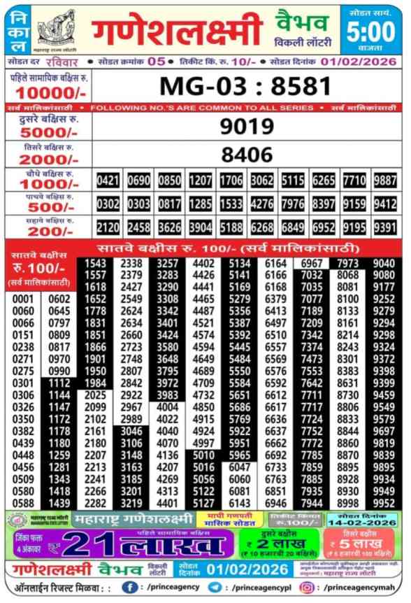 Maharashtra State Ganeshlaxmi Vaibhav Weekly Lottery ticket is only Maharashtra Weekly rupees 10 for 1 ticket, but 10 thousand is given as prize for winning the major. Results are also placed on this page which you can see Ganeshlaxmi Vaibhav Weekly Lottery Result today 1.2.2026 is searched by different names, Maharashtra State Ganeshlaxmi Vaibhav Weekly Lottery Result 05:00pm, Maharashtra State lottery 05:00pm result , Maharashtra State Lottery today Ganeshlaxmi Vaibhav Weekly lottery result, Maharashtra Ganeshlaxmi Vaibhav Lottery Result, Maharashtra State Ganeshlaxmi Vaibhav Weekly lottery result 2026, Ganeshlaxmi Vaibhav Weekly lottery result 05:00pm, Maharashtra State lottery 2026.