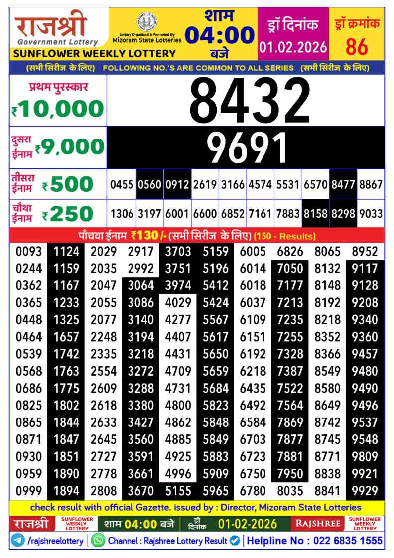 Mizoram Rajshree Lottery 1.2.2026 Today Result is Mizoram Rajshree Sunflower ravi Weekly Lottery Result draw whose Mizoram Lottery Result is published a day. Mainly Mizoram Rajshree Lottery is 4:00 PM Mizoram Rajshree Lottery but being combined with Lottery Sambad, Mizoram Rajshree Lottery will release the results of 04:00PM is published.