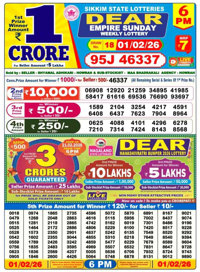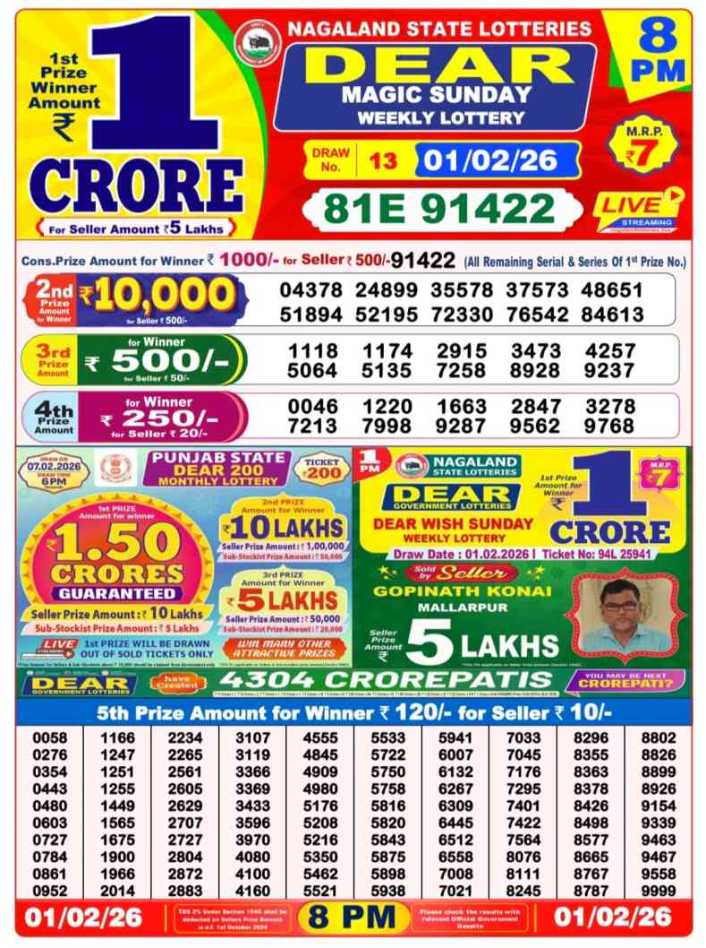 As per the official information provided by the Nagaland State Lotteries, 3.2.2026 Results the winner of today’s Dear First Winner award will receive INR 1 Crore from a ticket worth INR 6. You can check your result from the lotterysambad 3 2 26 link given below…