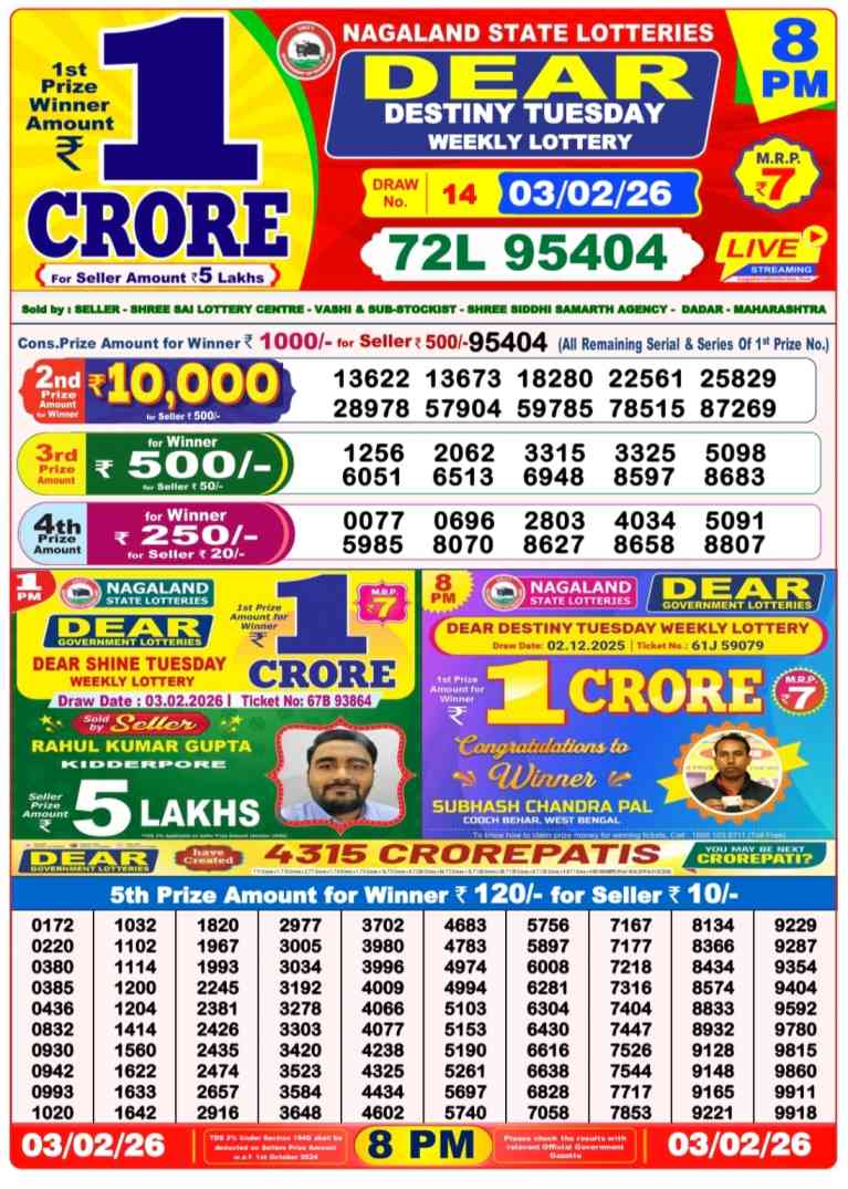 - Nagaland State Lottery Sambad Result 3.2.2026