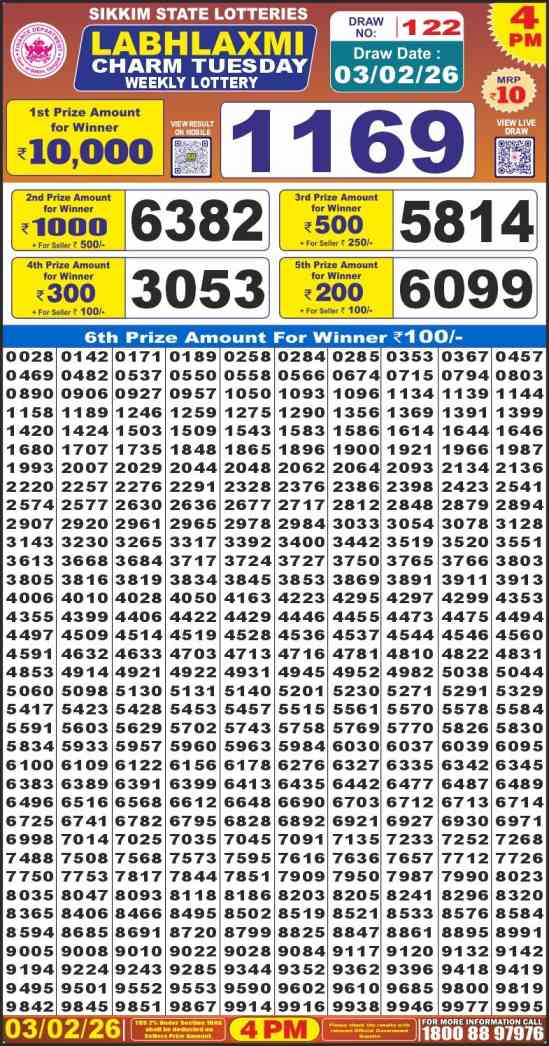 | Sikkim Labh laxmi Charm Tuesday Lottery Result Today Live 3.2.2026 | |