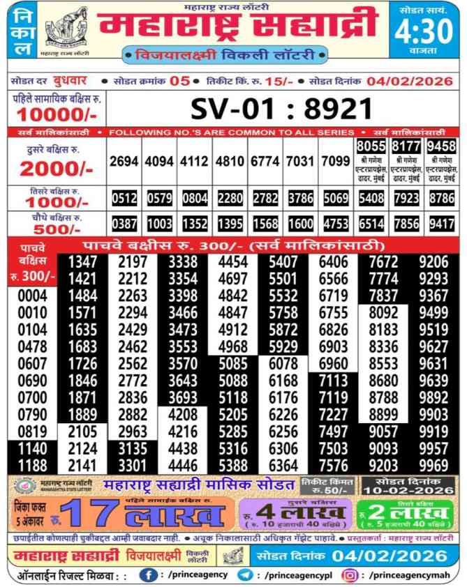 Maharashtra State Sahyadri Mahalaxmi Weekly Lottery ticket is only Maharashtra Sahyadri Weekly rupees 15 for 1 ticket, but 10 thousand is given as prize for winning the major. Results are also placed on this page which you can see Sahyadri Mahalaxmi Weekly Lottery Result today 4.2.2026 is searched by different names, Maharashtra State Sahyadri Mahalaxmi Weekly Lottery Result 4:30PM, Maharashtra State lottery 4:30PM result , Maharashtra State Lottery today Sahyadri Mahalaxmi Weekly lottery result, Maharashtra Sahyadri Mahalaxmi Lottery Result, Maharashtra State Sahyadri Mahalaxmi Weekly lottery result 2026, Sahyadri Mahalaxmi Weekly lottery result 4:30PM, Maharashtra State lottery 2026.