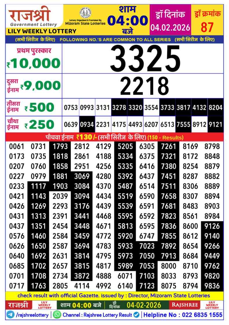 Mizoram Rajshree Lottery declares many bumper results. Today Rajshree Lily Lottery Result 2026 is Mizoram Rajshree Lottery at 03:30 PM whose result gets published on the page around 04:12 PM. Mizoram Rajshree Lottery Result ,4.2.2026 Lily Budh Result, Rajshree Lily Result Today Live 4:00PM, Mizoram Rajshree Lily Budh Weekly Result, Mizoram Rajshree Lottery Result 4:00PM, Mizoram Lily Budh Result 3:30 PM, Mizoram Lottery Result Today 4:00PM, Rajshree Lily Weekly Lottery 3:30 PM Result 4.2.2026.