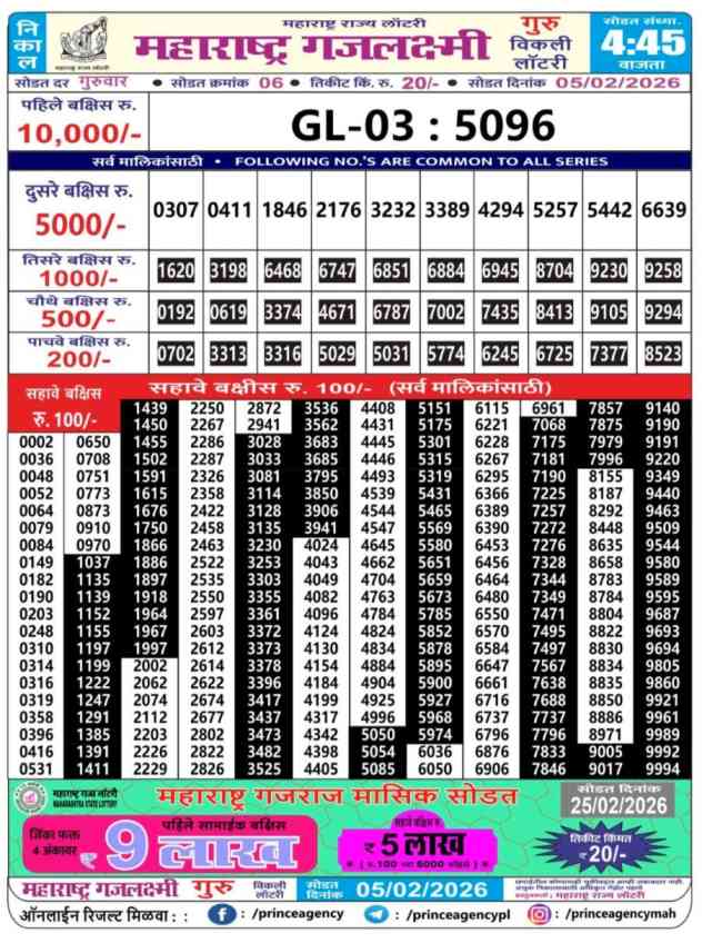 Maharashtra State Gajlaxmi Guru Weekly Lottery ticket is only Guru Weekly rupees for 1 ticket, but 1 Lakh is given as prize for winning the major. Results are also placed on this page which you can see Gajlaxmi Guru Weekly Lottery Result today 5.2.2026 is searched by different names, Maharashtra State Gajlaxmi Guru Weekly Lottery Result 4:45pm, Maharashtra State lottery 4:45pm result , Maharashtra State Lottery today Gajlaxmi Guru Weekly lottery result, Maharashtra Gajlaxmi Guru Lottery Result, Maharashtra State Gajlaxmi Guru Weekly lottery result 2026, Gajlaxmi Guru Weekly lottery result 4:45pm, Maharashtra State lottery 2026.
