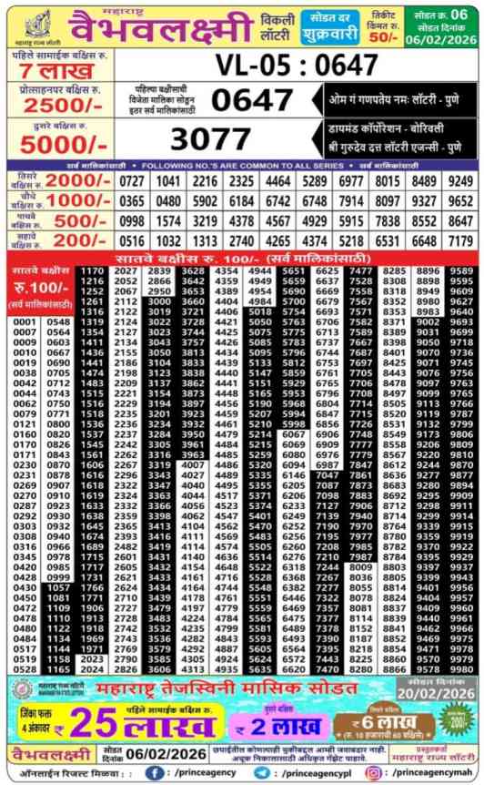 Maharashtra State Vaibhav Laxmi Lottery Weekly Today Latest Update on 06 February 2026 : -Maharashtra State Lottery’s Vaibhav Laxmi Weekly Lottery Results have been declared today on 6.2.2026 at 04:15PM.