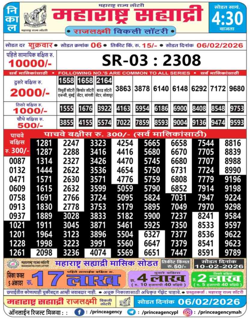 Maharashtra State Sahyadri Rajlaxmi Weekly Lottery ticket is only Maharashtra Sahyadri Weekly rupees 15 for 1 ticket, but 10 thousand is given as prize for winning the major. Results are also placed on this page which you can see Sahyadri Rajlaxmi Weekly Lottery Result today 6.2.2026 is searched by different names, Maharashtra State Sahyadri Rajlaxmi Weekly Lottery Result 4:30PM, Maharashtra State lottery 4:30PM result , Maharashtra State Lottery today Sahyadri Rajlaxmi Weekly lottery result, Maharashtra Sahyadri Rajlaxmi Lottery Result, Maharashtra State Sahyadri Rajlaxmi Weekly lottery result 2026, Sahyadri Rajlaxmi Weekly lottery result 4:30PM, Maharashtra State lottery 2026.
