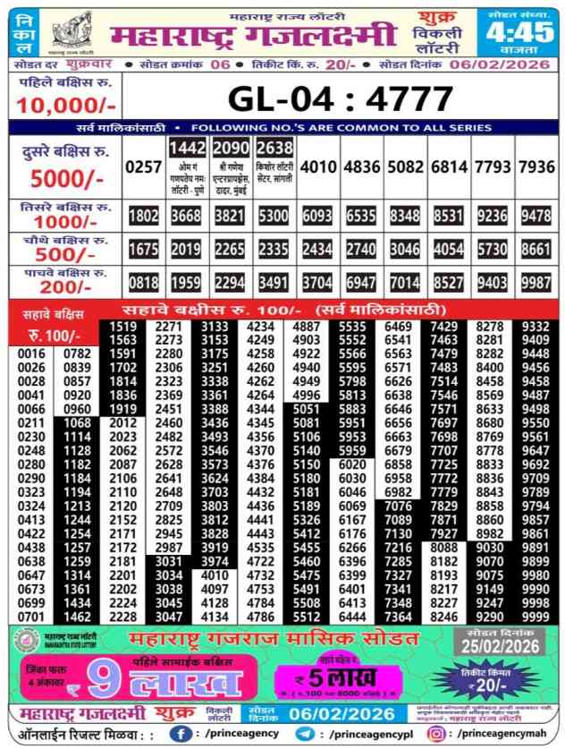 Maharashtra State Lottery 6.2.2026 Today Result is Maharashtra State Gajlaxmi Shukra Weekly Weekly lottery Result draw whose Maharashtra lottery result is published a day. Mainly Maharashtra State Lottery is 4:45 pm Maharashtra State Lottery but being combined with lottery sambad, Maharashtra State Lottery will release the results of 04:45pm is published.