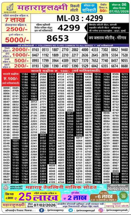 Maharashtra Laxmi WeeklyLottery Announced on 7.2.2026. Winner list Announcement by Maharashtra State Lotteries Board.
