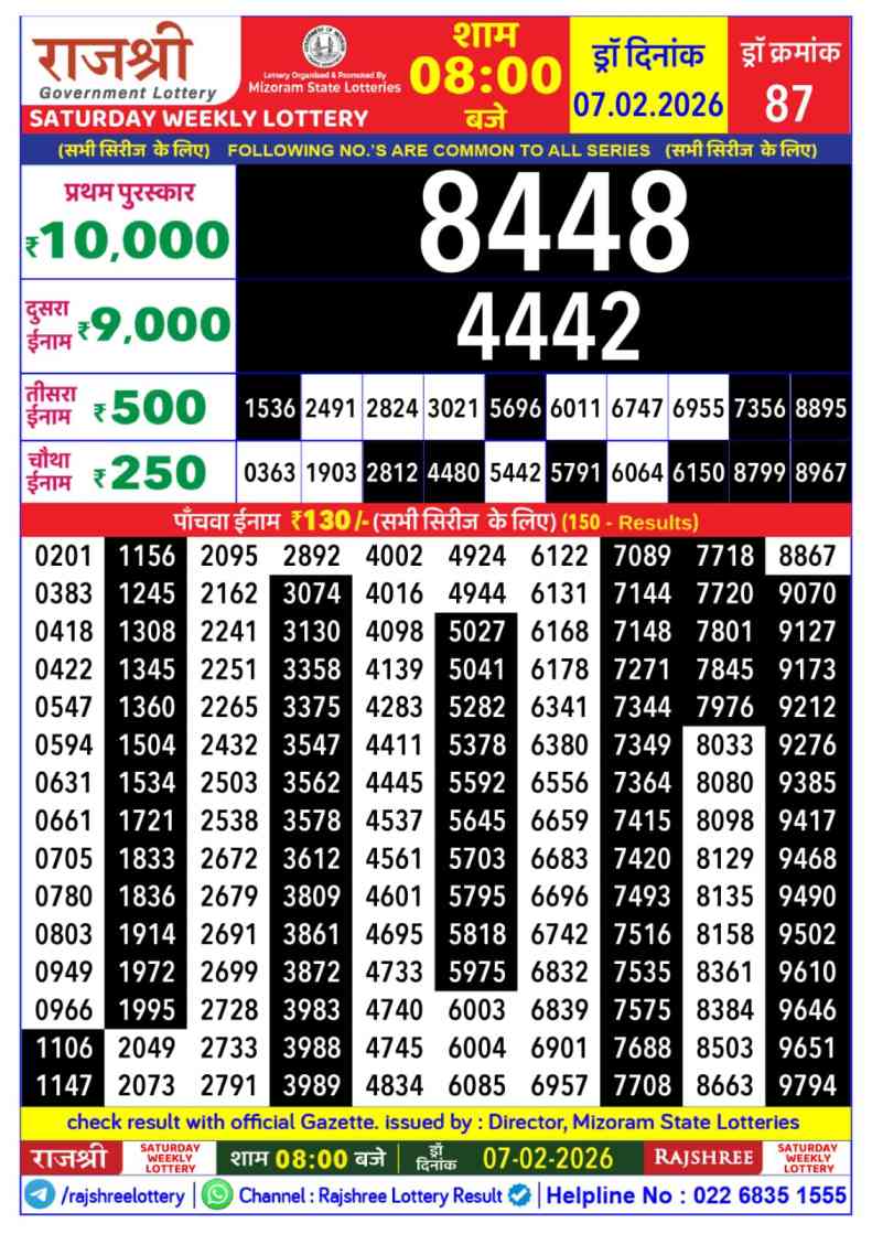 Download Mizoram Rajshree Lottery Saturday 7.2.2026 Today 08:00PM Result from here. Mizoram Rajshree Weekly Lottery Result Important Lottery of Mizoram Rajshree which is legally operated by the Rajshree Government there. You are satisfied to Get The Result of Saturday weekly Lottery at 4:00PM on this webpost Today’s Lottery Result of Mizoram Rajshree Lottery 08:00PM is published here.