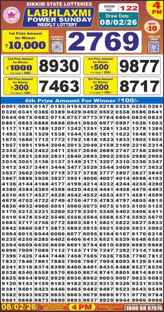 Sikkim State Labh laxmi Power Sunday Lottery ticket is only Labh laxmi Power rupees for 1 ticket, but 10,000 is given as prize for winning the major. Results are also placed on this page which you can see Labh laxmi Power Sunday Lottery Result today 8.2.2026 is searched by different names, Sikkim State Labh laxmi Power Lottery Result 4PM, Sikkim State lottery 4PM result , Sikkim State Lottery today Labh laxmi Power lottery result, Sikkim Labh laxmi Sunday Lottery Result, Sikkim State Labh laxmi Power Sunday lottery result 2026, Labh laxmi Power lottery result 4PM, Sikkim State lottery 2026.
