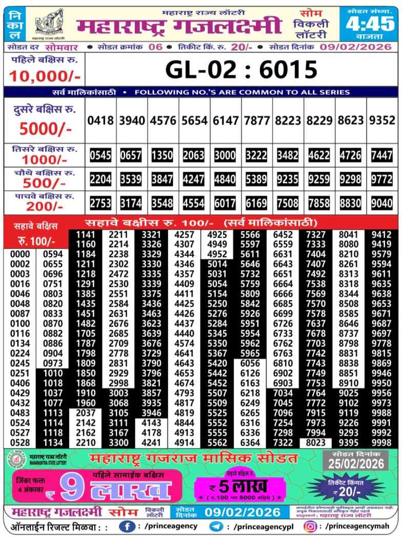 | Maharashtra Gajlaxmi Som Weekly Lottery Result Today Live 9.2.2026 | |
