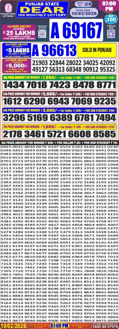Punjab State Lottery 10.2.2026 Today Result is Punjab State Dear 100 Monthly lottery Result draw whose Punjab lottery result is published a day. Mainly Punjab State Lottery is Provided Today Dear 100 Monthly Lottery 6PM Result, Punjab State Lottery but being combined with Punjab lottery sambad, Punjab State Lottery will release the results of Today Dear 100 Monthly Result Live 06:00pm