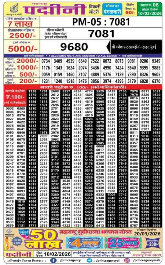 Maharashtra State Lottery declares many bumper results. Maharashtra Padmini  2026 Result is Maharashtra State Lottery at 04:15 PM whose result gets published on the page around 05:00 PM. Maharashtra State Padmini Weekly Lottery Result 10.2.2026 Live Draw Winner List at 4.15 PM, Maharashtra Dear Padmini Lottery 2026, Today Maharashtra Padmini Lottery, Maharashtra State Lottery Padmini Lottery Result Today Live, Maharashtra Padmini Draw 2026, Maharashtra Lottery Padmini Result 2026, Maharashtra Lottery 2026, Maharashtra State Lottery Result 2026, Maharashtra Padmini Lottery 10.2.2026 Result.