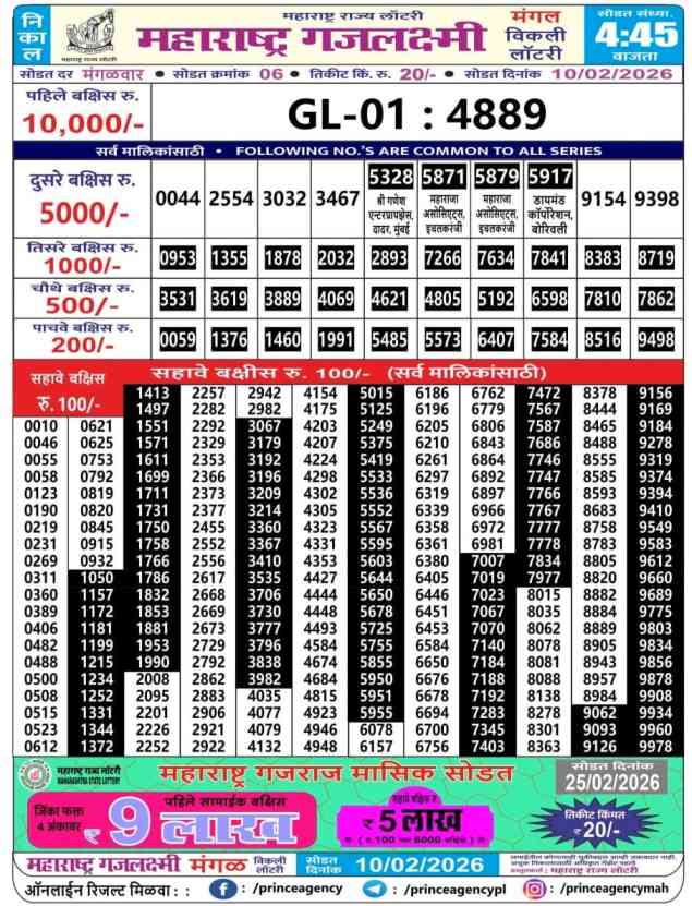 Maharashtra Gajlaxmi Mangal Weekly Lottery Result Today Live 10.2.2026