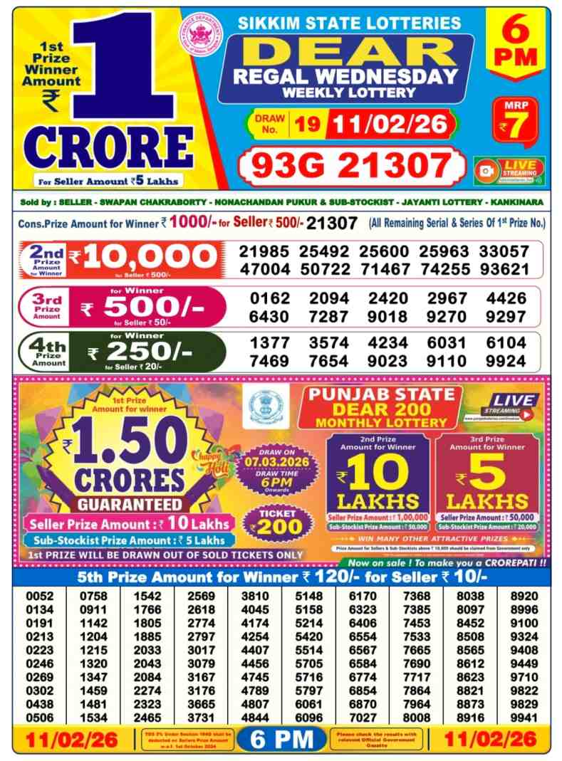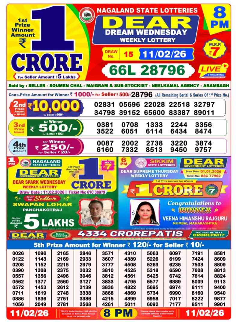 Nagaland State Lotteries Today Live draw Lottery Sambad Lottery Result 6pm. Dear Lottery Result will be presented today at 6pm on Lottery Sambad. Which is combined through West Bengal State Lottery. Lottery Sambad 11.2.2026 Lottery Result, Lottery Sambad 11.2.2026 Eveving Result 6pm, Dear Evening Lottery Sambad Result 11.2.2026. Dear Lottery Result 11.2.2026, Nagaland State Lottery Sambad Result Today 6pm, Today Live Lottery Sambad 11.2.2026, Lottery Sambad Live Today Result, Dear Sikkim State Lottery Evening Result, Sikkim Lottery Sambad Result 11.2.2026, Sikkim State Lottery 6pm Result Today Live.