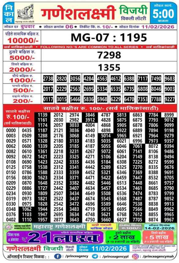 Maharashtra State Ganeshlaxmi Vijayi Weekly Lottery ticket is only Maharashtra Weekly rupees 10 for 1 ticket, but 10 thousand is given as prize for winning the major. Results are also placed on this page which you can see Ganeshlaxmi Vijayi Weekly Lottery Result today 11.2.2026 is searched by different names, Maharashtra State Ganeshlaxmi Vijayi Weekly Lottery Result 05:00pm, Maharashtra State lottery 05:00pm result , Maharashtra State Lottery today Ganeshlaxmi Vijayi Weekly lottery result, Maharashtra Ganeshlaxmi Vijayi Lottery Result, Maharashtra State Ganeshlaxmi Vijayi Weekly lottery result 2026, Ganeshlaxmi Vijayi Weekly lottery result 05:00pm, Maharashtra State lottery 2026.