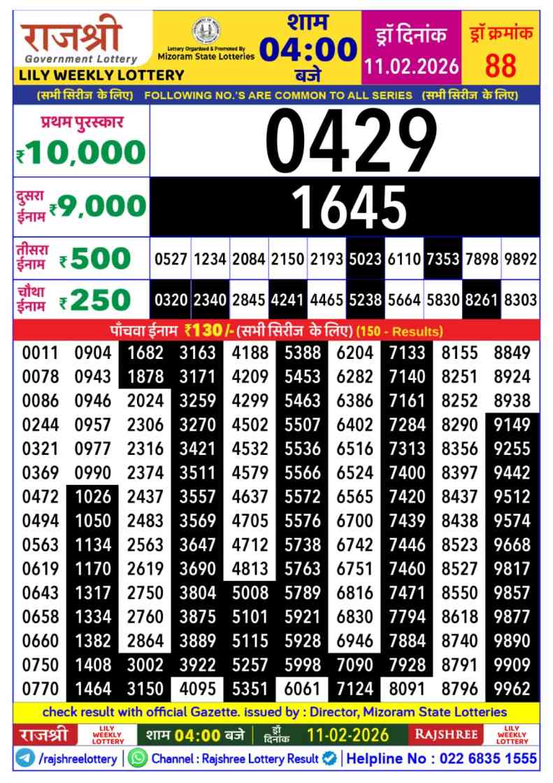 Mizoram Rajshree Lottery declares many bumper results. Today Rajshree Lily Lottery Result 2026 is Mizoram Rajshree Lottery at 03:30 PM whose result gets published on the page around 04:12 PM. Mizoram Rajshree Lottery Result ,11.2.2026 Lily Budh Result, Rajshree Lily Result Today Live 4:00PM, Mizoram Rajshree Lily Budh Weekly Result, Mizoram Rajshree Lottery Result 4:00PM, Mizoram Lily Budh Result 3:30 PM, Mizoram Lottery Result Today 4:00PM, Rajshree Lily Weekly Lottery 3:30 PM Result 11.2.2026.