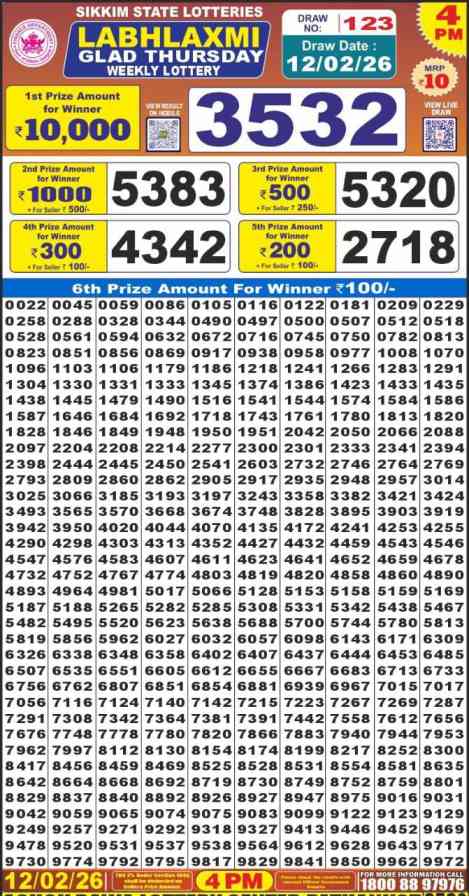 Sikkim State Labh laxmi Glad Thursday Lottery ticket is only Ten rupees for 1 ticket, but 10,000 is given as prize for winning the major. Results are also placed on this page which you can see Labh laxmi Glad Thursday Lottery Result today is searched by different names, Sikkim State Labh laxmi Glad Lottery Result 4pm, Sikkim State lottery 4PM result , Sikkim State Lottery today Labh laxmi Glad lottery result, Sikkim Labh laxmi Thursday Lottery Result, Sikkim State Labh laxmi Glad Thursday lottery result 12.2.2026, Labh laxmi Glad lottery result 4pm, Sikkim State lottery 12.2.2026.