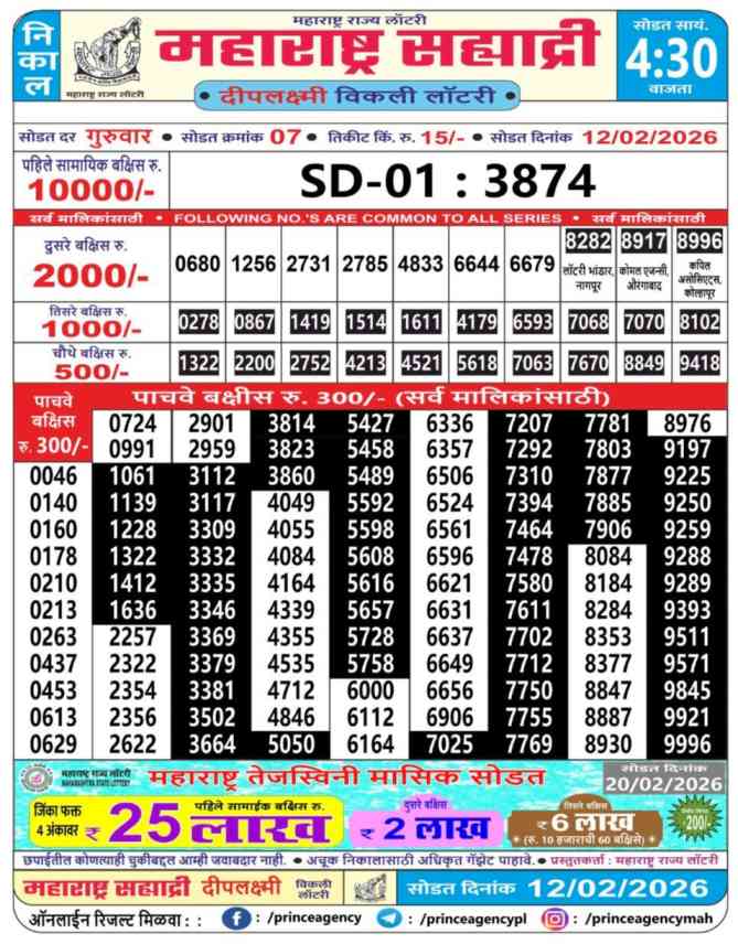 | Maharashtra State Sahyadri Deeplaxmi Weekly Lottery 12.2.2026 Result | Maharashtra State Lottery 4:30pm Result | Maharashtra State Sahyadri Deeplaxmi Weekly Lottery Result Today 04:30pm| Maharashtra State Lottery Result 04:30pm Today Live Draw | Maharashtra State Lottery | Check Maharashtra Sahyadri Deeplaxmi Weekly Weekly Lottery Result | |