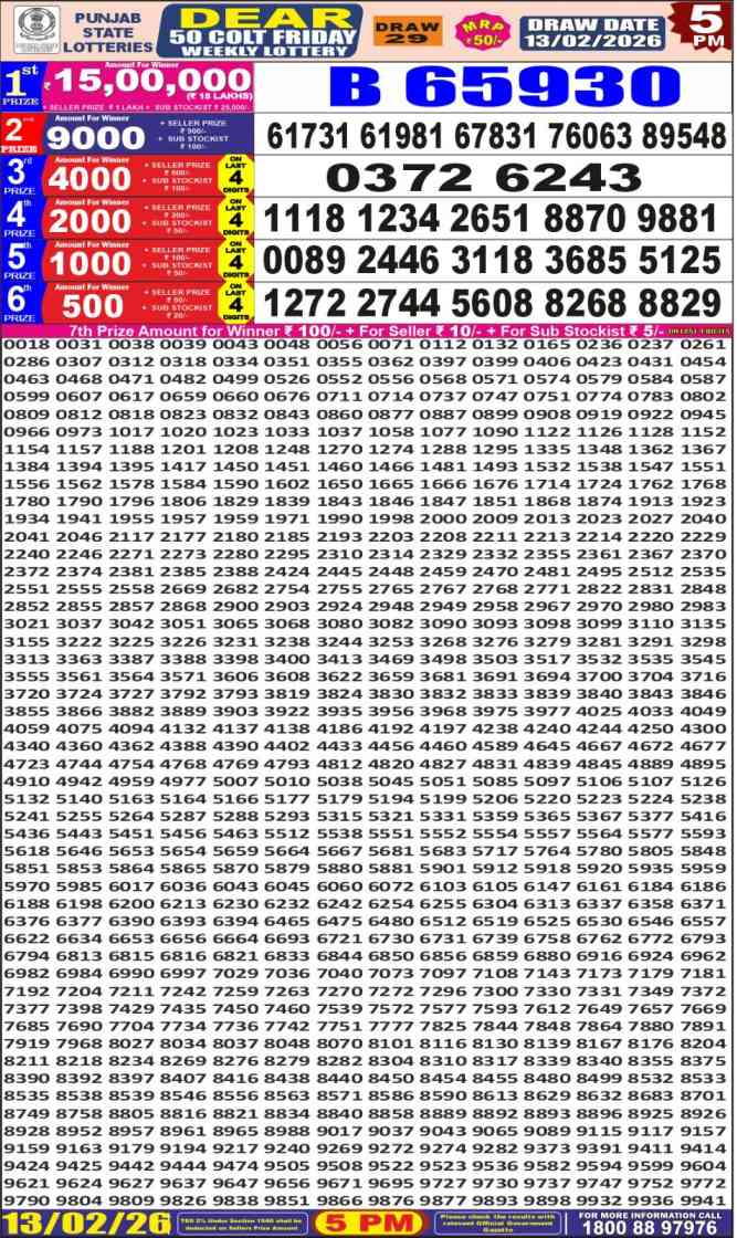 Punjab State Lottery declares many bumper results. Dear Friday Weekly Lottery Result 2026 is Punjab State Lottery at 06:00 PM whose result gets published on the page around 06:30 PM. Punjab State Lottery Result, 13.2.2026 Dear 50 Colt Result, Dear Friday Result Today Live 6PM, Punjab Dear Weekly Result 6PM, Punjab State Dear 50 Colt Friday Result, Punjab State lottery result 6PM, Dear Friday Weekly Result, Dear 50 Colt result, Dear 50 Colt Result, Punjab lottery result today 6PM, punjab Dear Friday Lottery result 13.2.2026, Punjab Dear Friday Weekly Lottery Result.