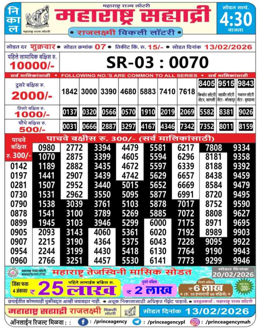Maharashtra State Sahyadri Rajlaxmi Weekly Lottery ticket is only Maharashtra Sahyadri Weekly rupees 15 for 1 ticket, but 10 thousand is given as prize for winning the major. Results are also placed on this page which you can see Sahyadri Rajlaxmi Weekly Lottery Result today 13.2.2026 is searched by different names, Maharashtra State Sahyadri Rajlaxmi Weekly Lottery Result 4:30PM, Maharashtra State lottery 4:30PM result , Maharashtra State Lottery today Sahyadri Rajlaxmi Weekly lottery result, Maharashtra Sahyadri Rajlaxmi Lottery Result, Maharashtra State Sahyadri Rajlaxmi Weekly lottery result 2026, Sahyadri Rajlaxmi Weekly lottery result 4:30PM, Maharashtra State lottery 2026.