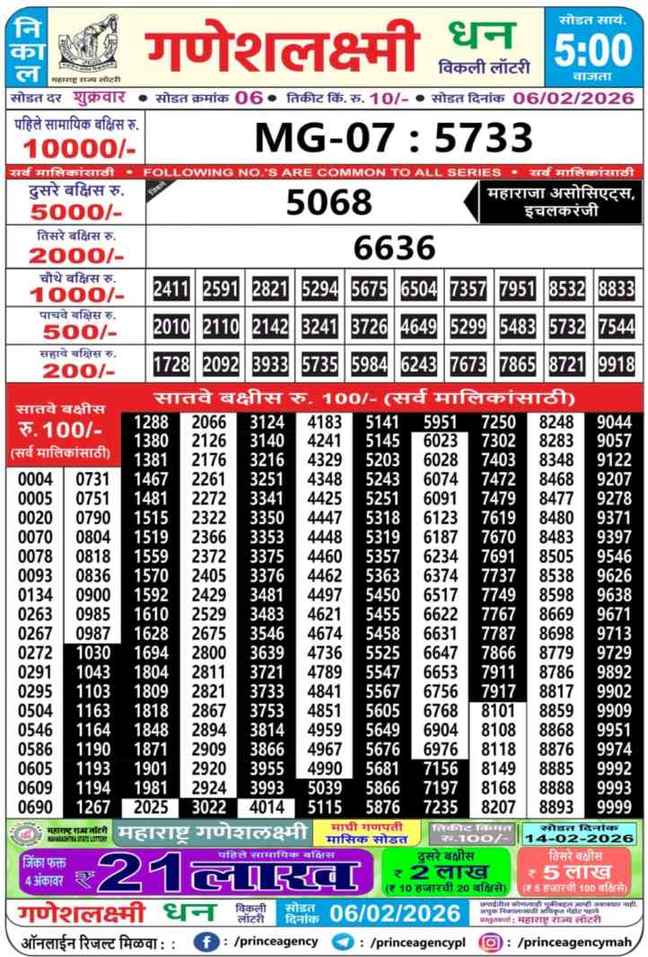 | Maharashtra Ganeshlaxmi Dhan Weekly Lottery Result Today Live 13.2.2026 | |
