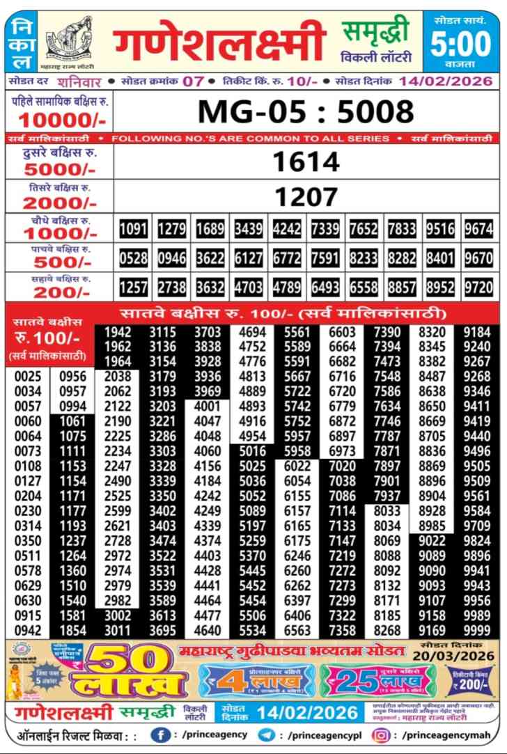Maharashtra State Lottery 14.2.2026 Today Result is Maharashtra State Ganeshlaxmi Samriddhi Weekly Weekly lottery Result draw whose Maharashtra lottery result is published a day. Mainly Maharashtra State Lottery is 05:00 pm Maharashtra State Lottery but being combined with lottery sambad, Maharashtra State Lottery will release the results of 5:00pm is published.