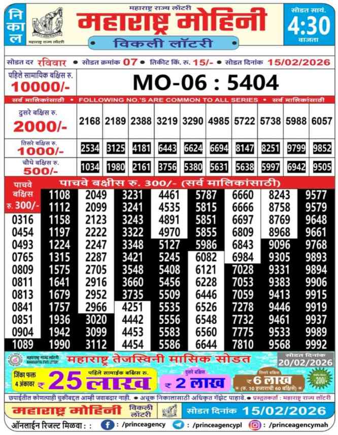 Maharashtra State Mohini Lottery Weekly Today Latest Update on 15 February 2026 : -Maharashtra State Lottery’s Mohini Weekly Lottery Results have been declared today on 15.2.2026 at 04:15PM.