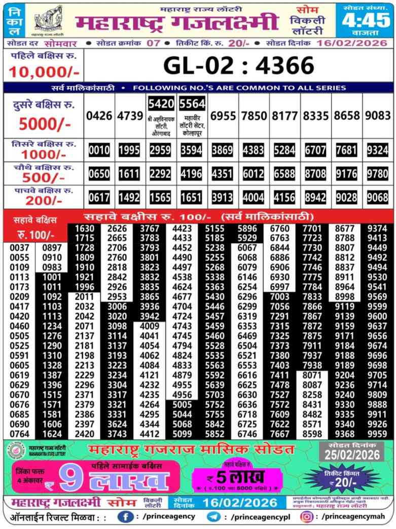 | Maharashtra Gajlaxmi Som Weekly Lottery Result Today Live 16.2.2026 | |